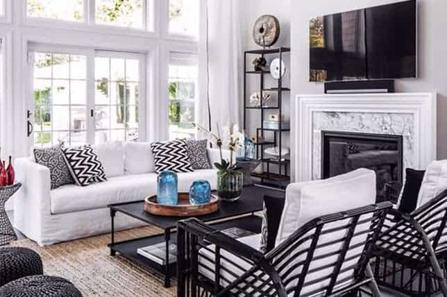 The middle family room is dominated by white fabrics and paint. The light, airy look is accented with chevron pillows and black rattan chairs; creating a sense of charm.