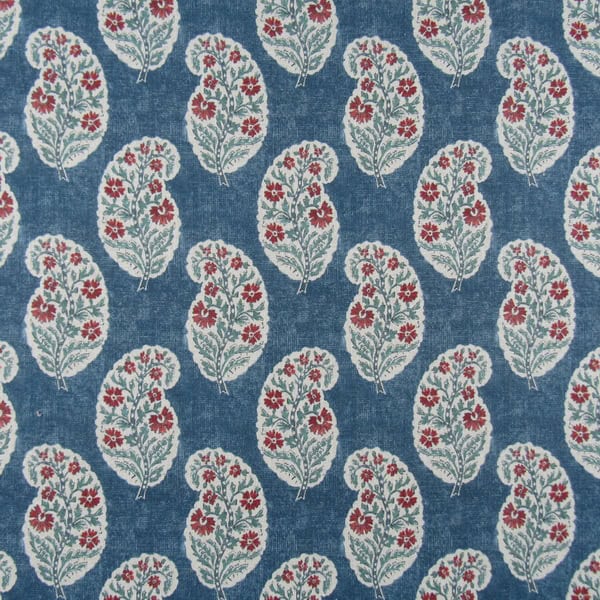 Covington Fabrics Kurta 593 Indigo showcases a small-scale paisley pattern with red and teal accents on a blue background, printed on a versatile linen-rayon blend. This fabric works perfectly for furniture upholstery, draperies, pillows, bedding, and cushions.
